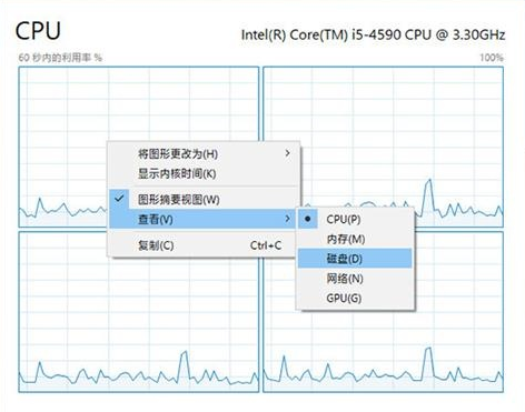 除了左侧监控栏外,右侧的性能标签也是可以双击的。双击之后,任务管理器同样会显示出该项目的曲线图。而且在这个视图下右键菜单依旧有效,如果需要你也可以通过右键,快速切换CPU、内存、磁盘、网络、GPU等